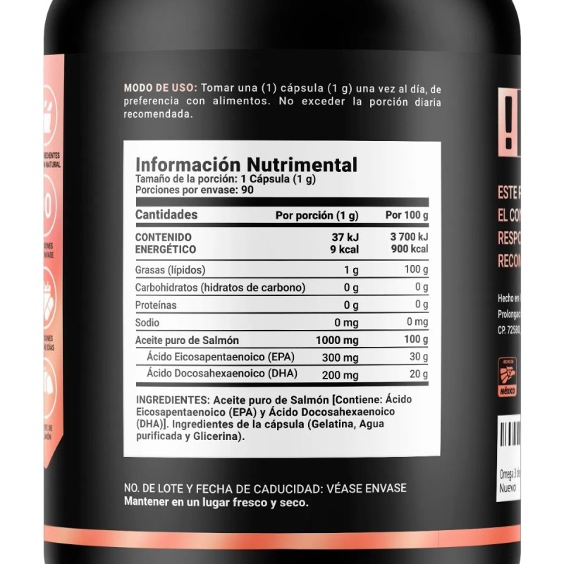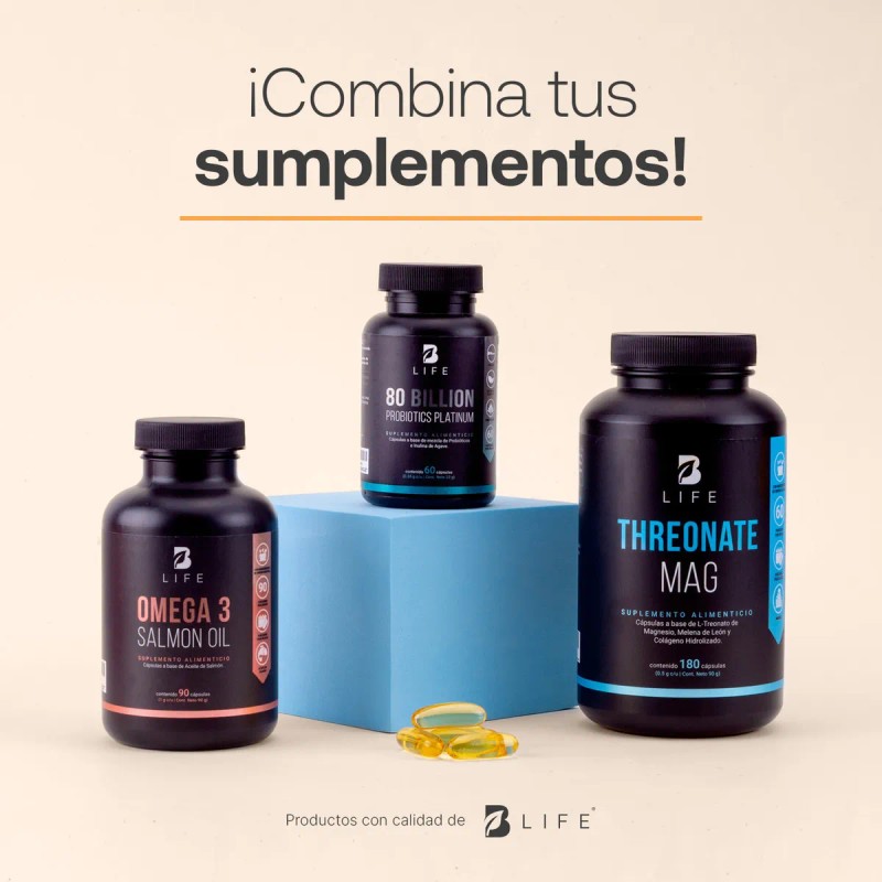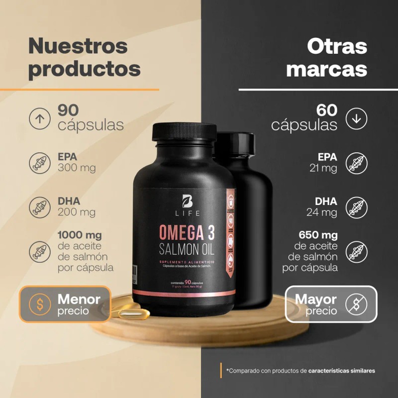 ¡Disfruta la formulación de Omega 3 Salmon Oil B Life! Diseñada a base 1000 mg de Aceite Puro de Salmón, en comparación con otras fórmulas que solo contienen 450 mg. Cada cápsula aporta Ácido Eicosapentaenoico (EPA) y Docosahexaenoico (DHA). Dos ácidos grasos esenciales para ti. Contiene 90 cápsulas.