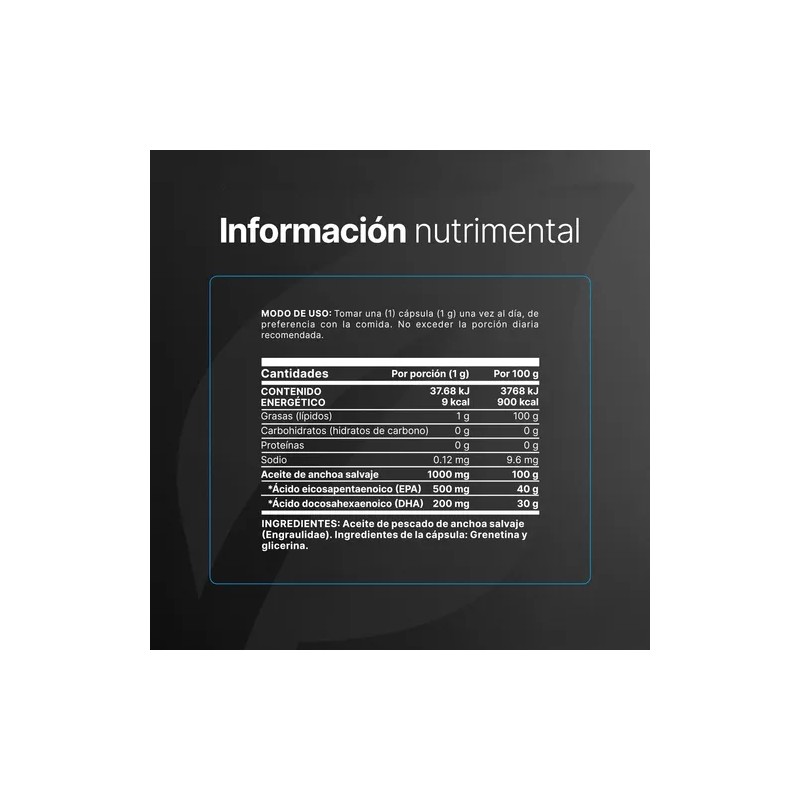 Diseñada a base de 1000 mg de Aceite de Anchoa Salvaje; libre de metales pesados, a comparación de otras fórmulas que sí contienen estos ingredientes nocivos. Cada una de nuestras cápsulas aporta Ácido Eicosapentaenoico (EPA) y Docosahexaenoico (DHA). Dos ácidos grasos valiosos para tu bienestar. Contiene 90 cápsulas.
