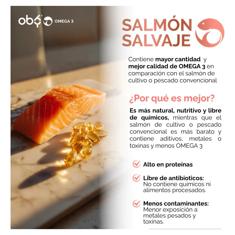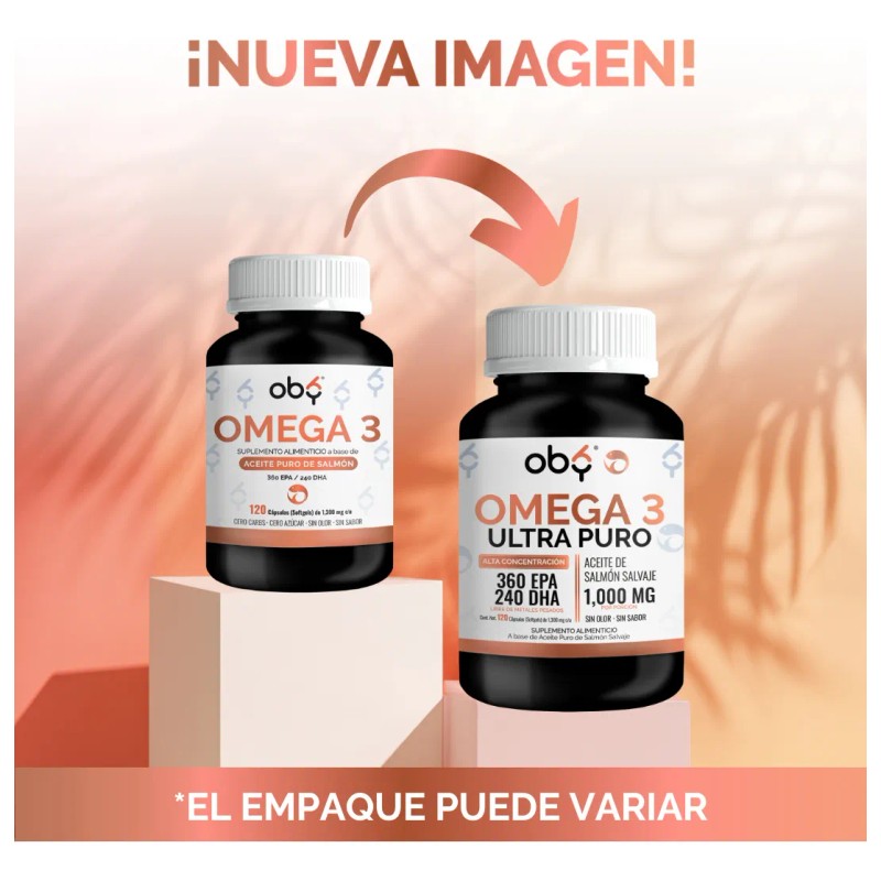 - Omega 3 Premium de Oby con Aceite Puro de Salmón Salvaje : 1000 mg de Aceite Puro de Salmón Salvaje + Ácidos grasos de ALTA CONCENTRACIÓN: DHA + EPA. 120 capsulas con tecnologia en Softgels (sin sabor y sin olor) para 4 meses de consumo. Doble Concentración superior garantizando que recibas la dosis óptima de Omega 3 en cada toma: