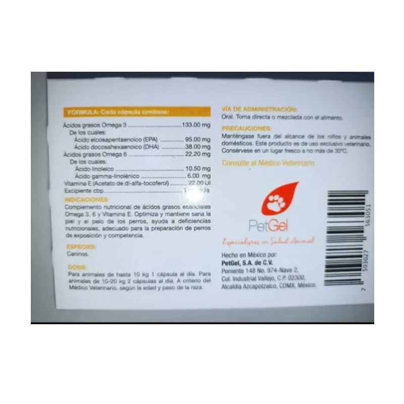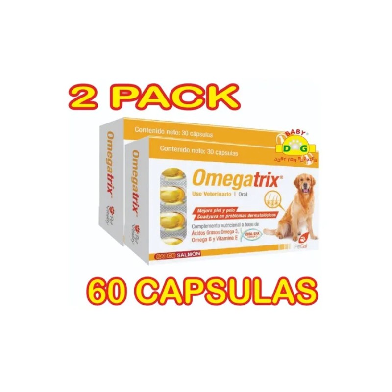 OmegaTrx es un suplemento nutricional en cápsulas de sabor a salmón, diseñado para perros, que contiene ácidos grasos esenciales y vitamina E para mejorar la salud de su piel y pelaje. Se presenta en una caja sin ventana con 30 cápsulas, enviando dos cajas para un total de 60 cápsulas, y se administra oralmente según la dosis indicada. Es un producto exclusivo para perros, y para facturación, se debe enviar la información fiscal después de recibirlo.