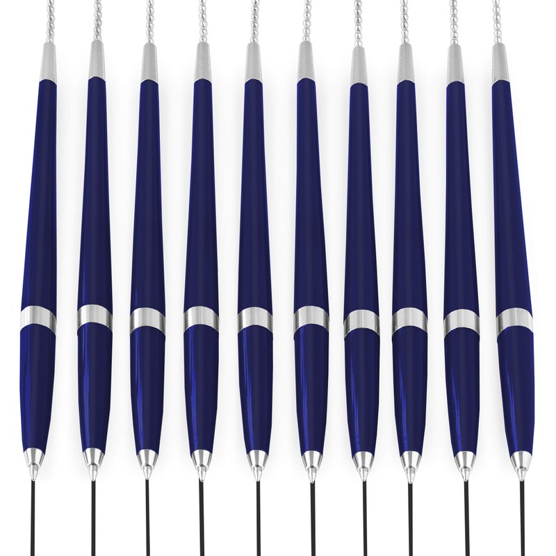 - This set contains ten pens with a blue barrel and a chrome chain.