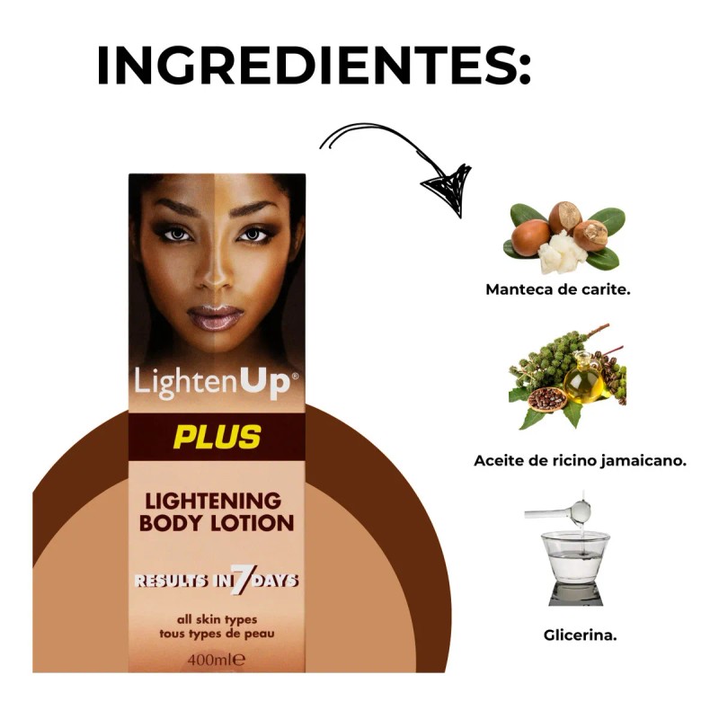 ¿Manchas oscuras? ¿Tono desigual? La loción corporal LightenUp PLUS está formulada con ingredientes iluminadores y naturales que aclaran visiblemente las manchas, igualan el tono de la piel y dejan tu cuerpo hidratado y suave. Ideal para mujeres que desean una piel más luminosa y uniforme.
