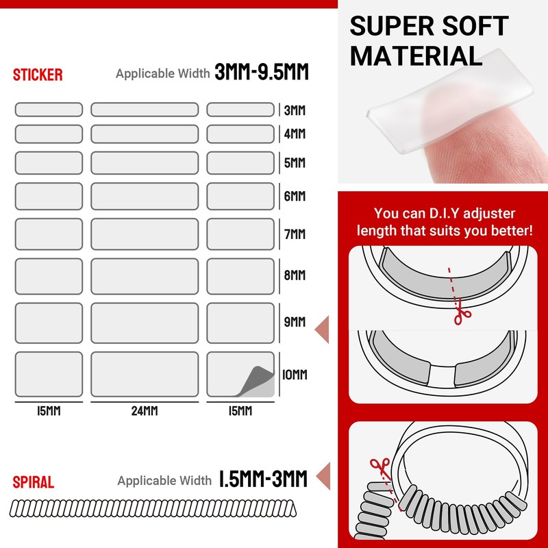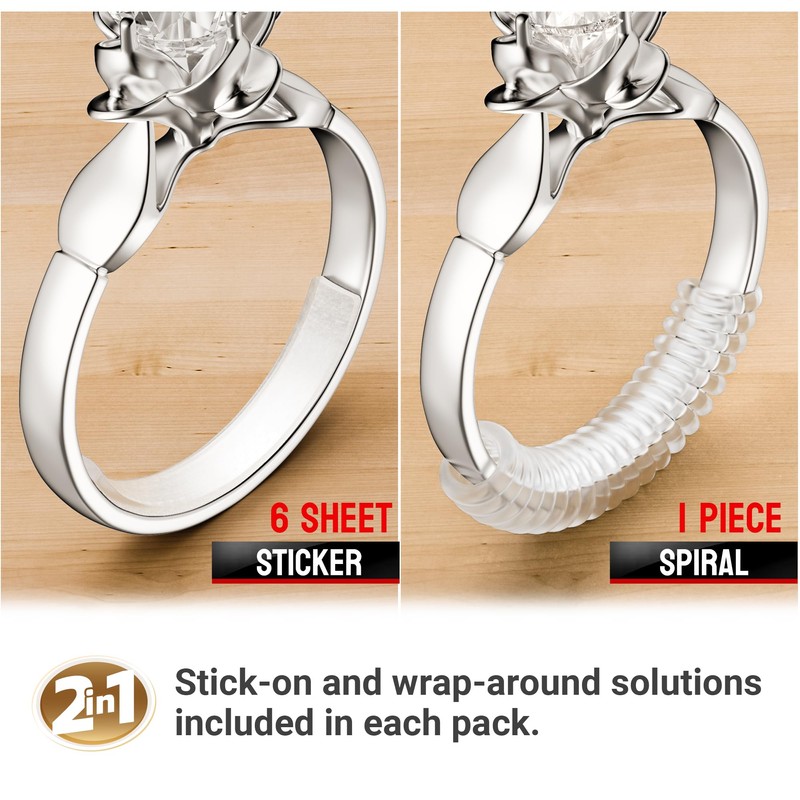 - Easy to Use: Choose the appropriate size of the ring adjuster and stick it in the inside of the ring band,press it lightly with your finger to better attach to the ring.If not tighten,you can use the longer sticker to fix it.If the spiral adjuster is too long, it can be trimmed with scissor.