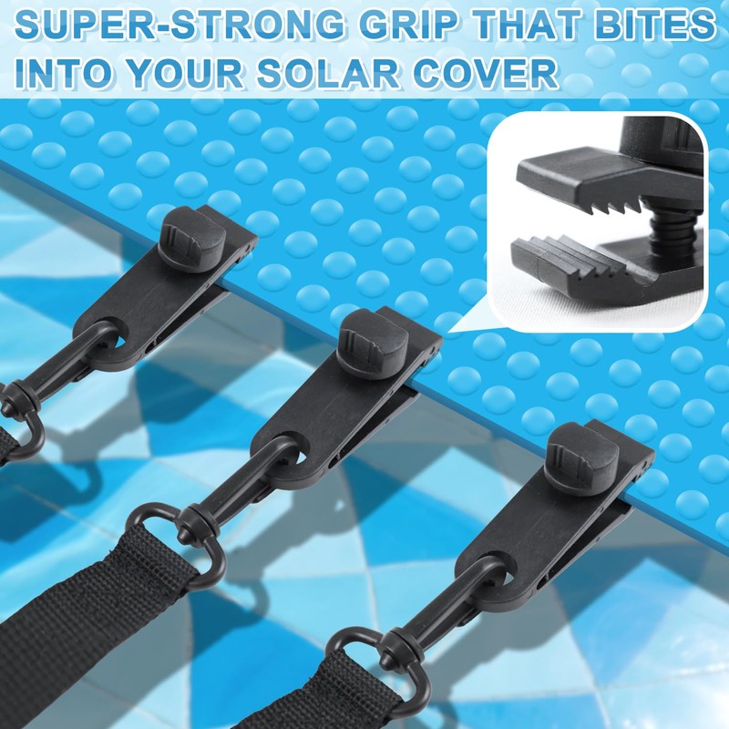 - ⭐【Fixed Firmly - Pool Solar Cover Reel Attachment Kit】Keep your cover securely locked! Our clips feature sharp serrated teeth that bite into the solar cover material without tearing it. This super-strong grip ensures your cover stays firmly in place, even on large inground pools with frequent rolling/unrolling.