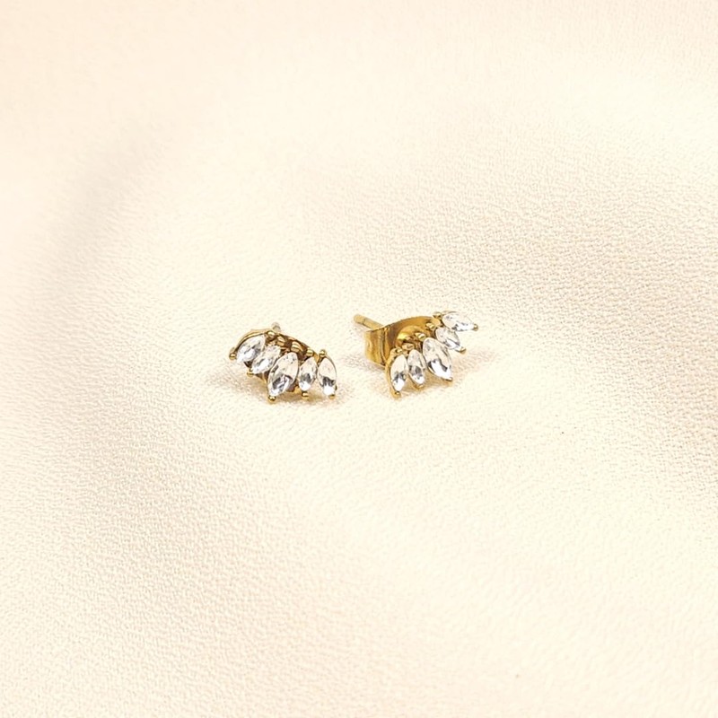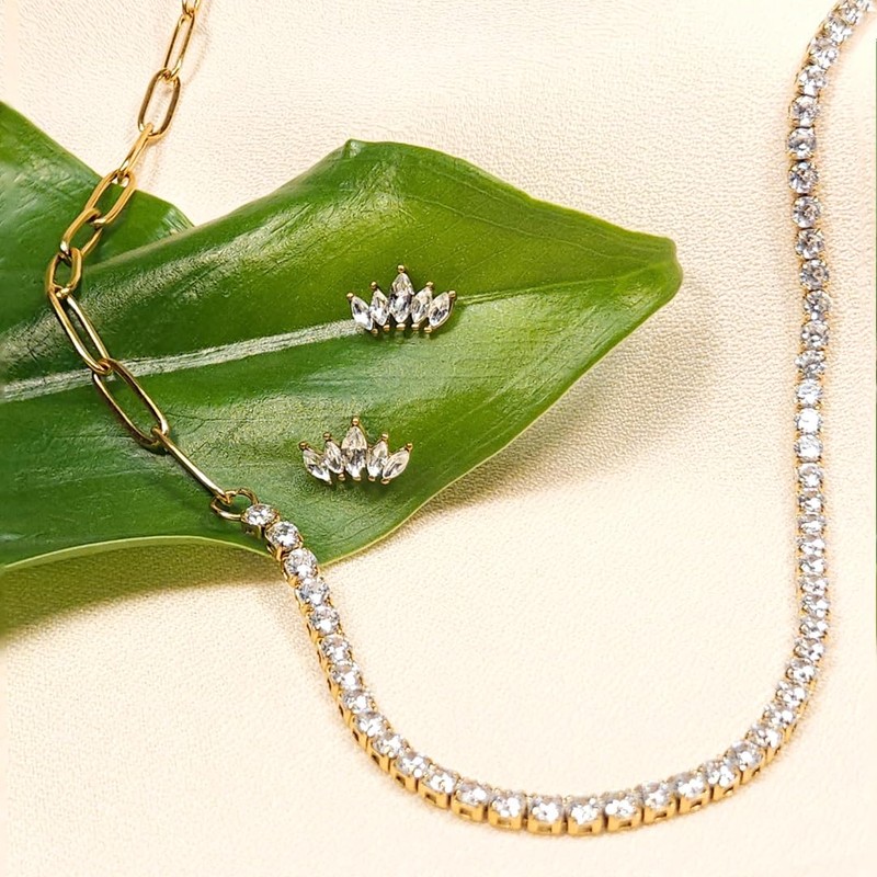 - GRAN CALIDAD: Joyería de acero inoxidable 316L, diseño mitad cadena de eslabón clip y mitad zirconias de 2.5 mm, la longitud del collar es de 40 cm más 5 cm de extensión, perfecto para ajustarlo a tu gusto; los aretes con cierre de mariposa cuentan con piedras de zirconia asemejando un diseño de corona miden 9.5 mm. Ambas piezas cuentan con chapa de oro de 18k.