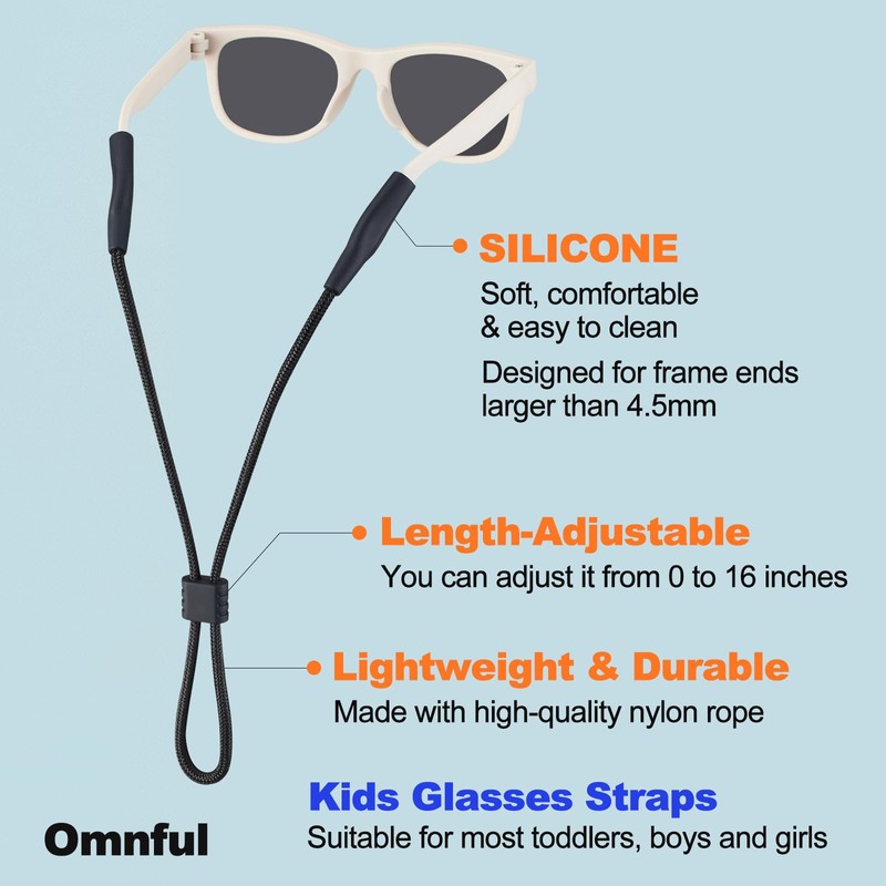 - Everyday Safety: Keep your kid's sunglasses secure while they play, The Omnful Kids Glasses Straps ensure that your children's sunglasses stay on their face during outdoor activities like sports, seaside, hiking, and fishing, preventing them from falling off and getting lost. We have prepared multi-colored glasses straps for kids.