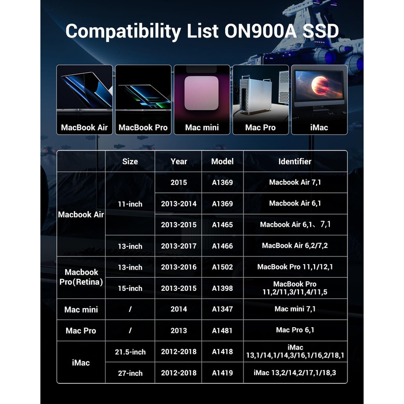 - Compatible with Macbool Air: A1369(2015), A1369(2013-2014), A1465(2013-2015), A1466(2013-2017); Macbook Pro(Retina):A1502(2013-2016), A1398(2013-2015); Mac mini: A1347(2014); Mac Pro: A1481(2013); iMac: A1418(2012-2018), A1419(2012-2018)