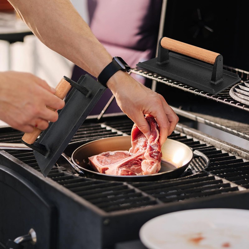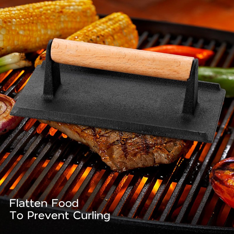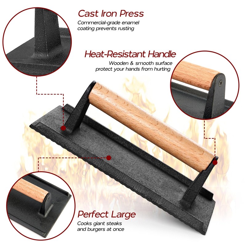 - Wooden Handle: our grill press's handle is heat-resistant, smooth and burr-free, and its ergonomic design reduces hand fatigue while ensuring a secure and comfortable grip