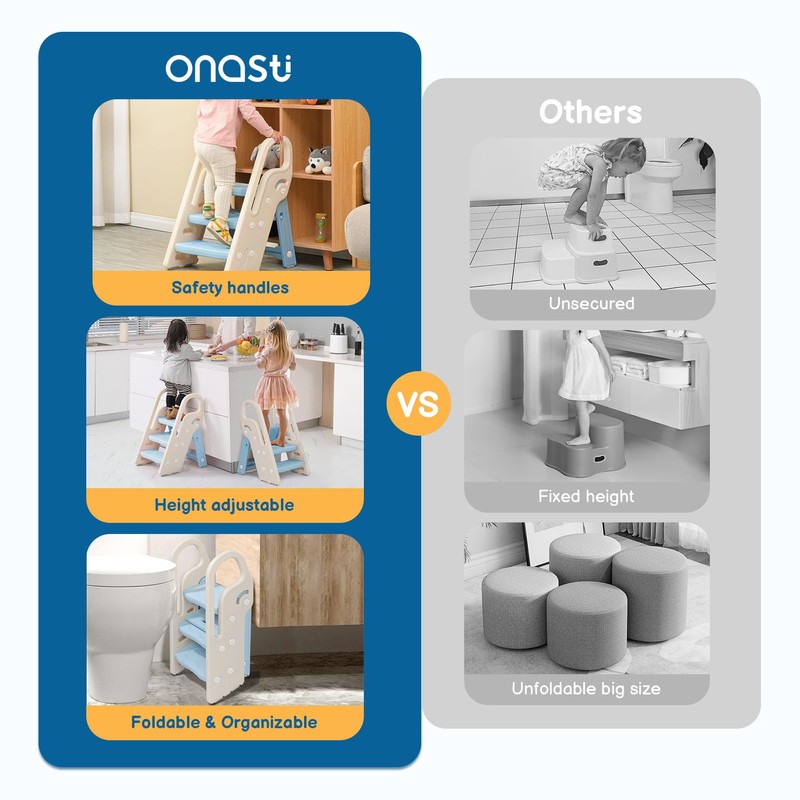 - 【Height Adjustable】The top panel can be easily turned 270, our 3 step stool will be converted into a 2 step stool for kids or a toddler chair! Onasti toddler stepping stool is suitable for Children at different ages.