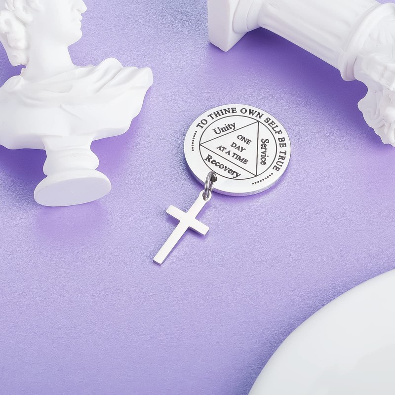 One Day at A Time Sobriety Gift for Men Women Serenity Prayer Coin Cross Charm To Thine Own Self Be True Triplate AA Sobriety Chip Recovery Anniversary Token Best Sobriety Gifts, Stainless Steel, No