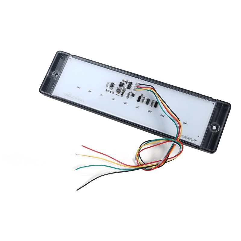 - ♦Specifications: 12V-24V Overall Size (Approx.): Length 11.8 x Height 3.1 x Depth 0.9 inches (300 x 80 x 22 mm) ♦ Mounting Position (Approx.): 10.9 inches (275 mm) ♦ Wiring: White → Back Lamp / Red → Brake / Blue (Green) → Small Light / Yellow → Flowing Turn Signal / Black → Ground ※ Wire color may vary depending on the lot. Please acknowledge