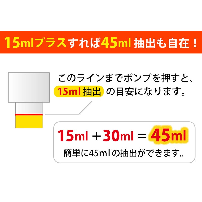 - *Cut the tube according to the plastic bottle you want to set and adjust the length.Press the pump to the point line to dispense approx. 0.5 fl oz (15 ml).When you want to measure 1.5 fl oz (45 ml), you can dispense 1.5 fl oz (45 ml) with 1 push of 1.0 fl oz (30 ml) + 1/2 push of 0.5 fl oz (15 ml) (up to the line).