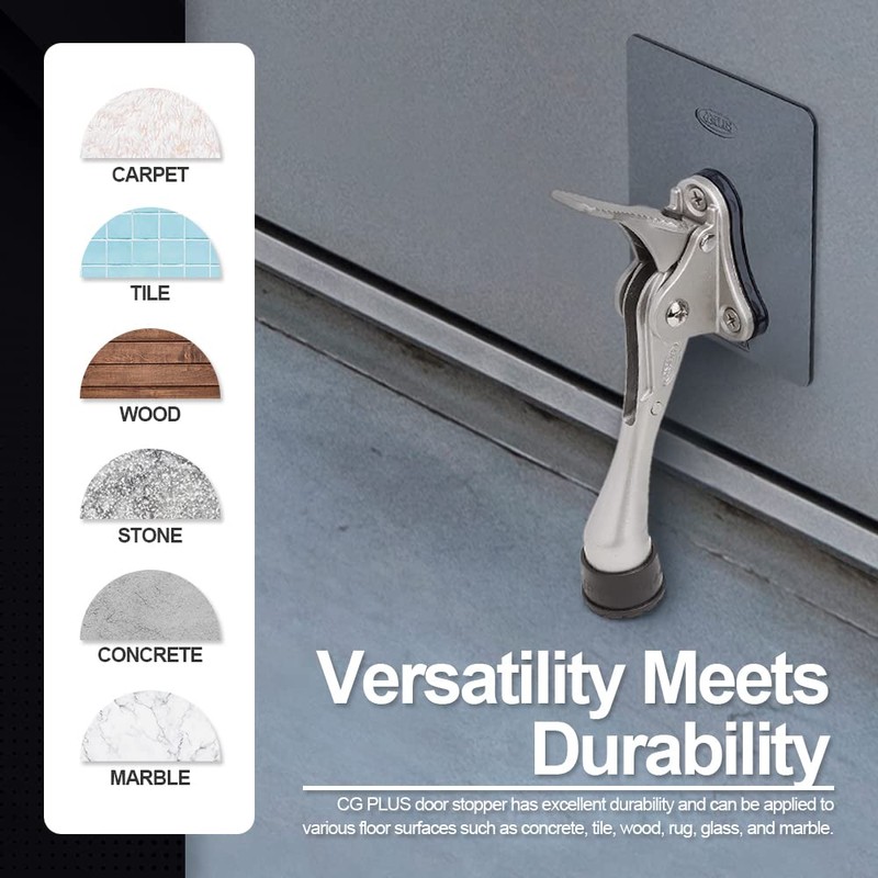- Versatility Meets Durability – CG PLUS door stopper has excellent durability and can be applied to various floor surfaces such as concrete, tile, wood, rug, glass, and marble. In addition, it is designed with a three-dimensional curved structure to prevent slipping, enabling stable use. It is made of Polycarbonate (PC) which is an airplane glass material and is impact-resistant.