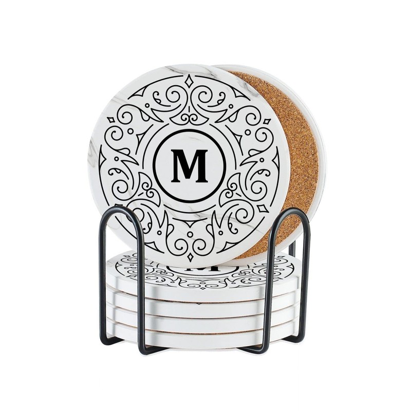 Onebttl Monogrammed Coaster Gifts Set of 6, Initial Letter, Ceramic, Absorbent with Cork Base, Home Decor for Family, Housewarming, Thanksgiving, Friends, Birthday, Christmas - M
