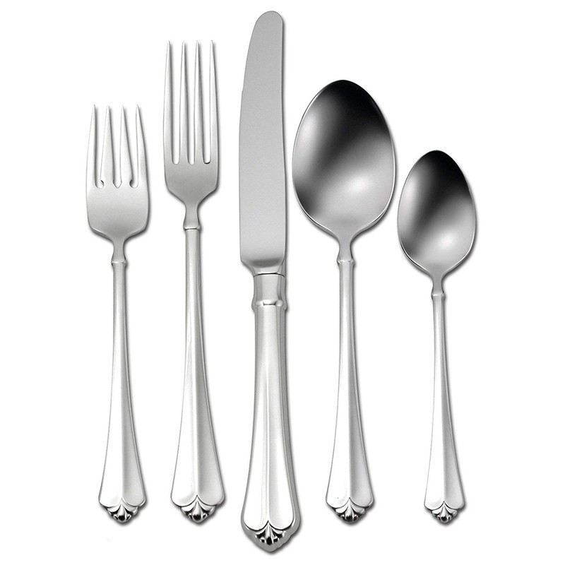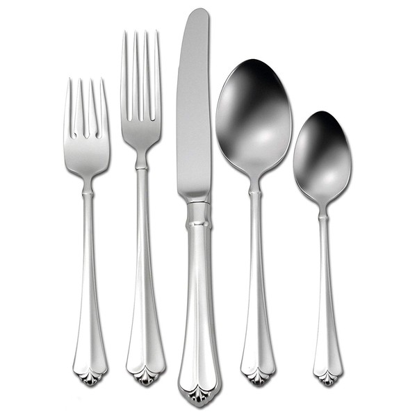 45-piece flatware set with service for 8. Set includes 8 each: salad fork, dinner fork, dinner knife, dinner spoon and teaspoon. Also includes: serving spoon, pierced serving spoon, meat fork, butter knife and sugar spoon. 18/10 stainless steel. Durable and stylish. Tasteful. Transitional. Timeless. A traditional pattern with modern appeal, Juilliard is noted for its sculptured fleur-de-lis detail and gracefully stylized handle. This popular design works well with many different dinnerware designs. Dishwasher safe, never need polishing Limited lifetime warranty. Each piece of fine quality Oneida stainless is warranted against defects in workmanship and materials for the lifetime of the original owner.