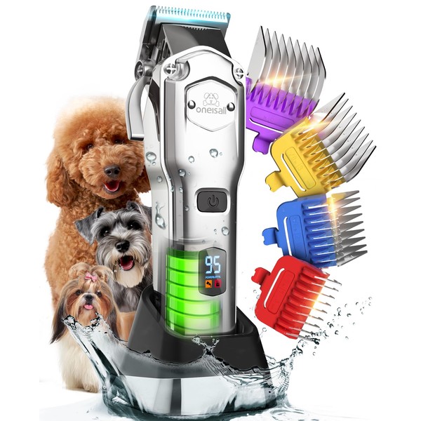 oneisall Dog Clippers for Grooming Thick Hair Professional,Cordless/Low Noise Pet Grooming Kit with Detachable Metal Combs, Rechargeable Heavy-Duty Pet Clippers for Thick/Curly/Fine/Wavy Hair (Sliver)