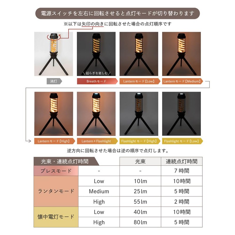 - Lighting order: Breath: Lantern mode (Low - Medium - High), Lantern mode (High), Flashlight mode (High), Flashlight mode (High), Flashlight mode (Low - High). Accessories: Tripod, Carabiner, Hook for Carabiner, USB charging cord (23.6 inches (60 cm)
