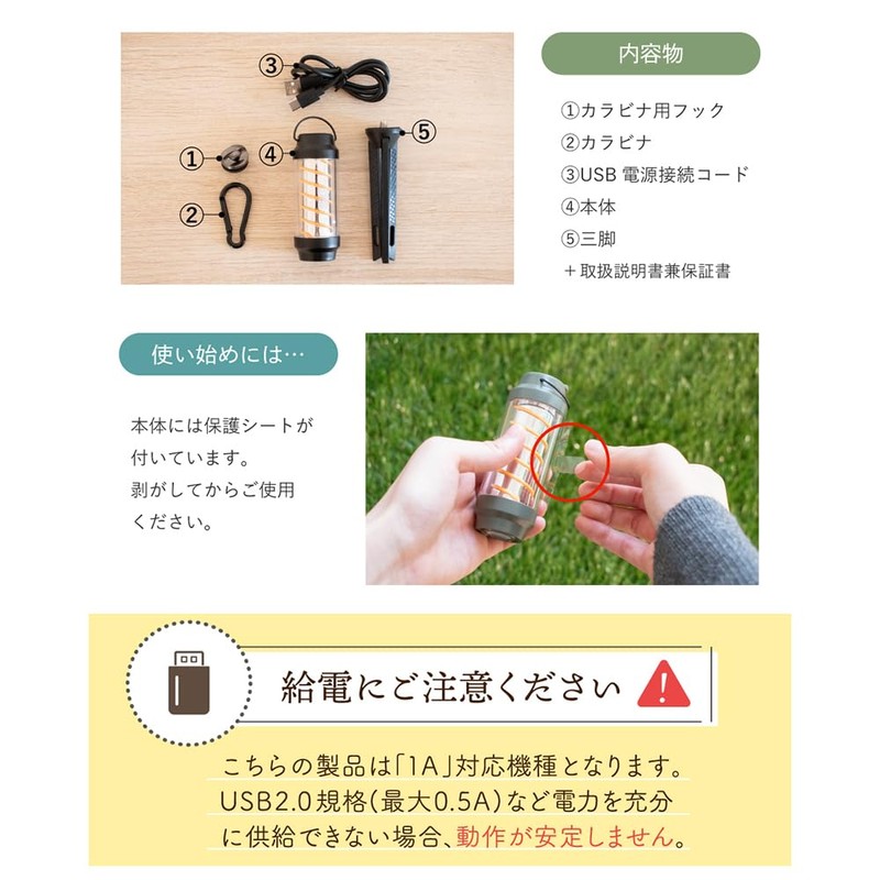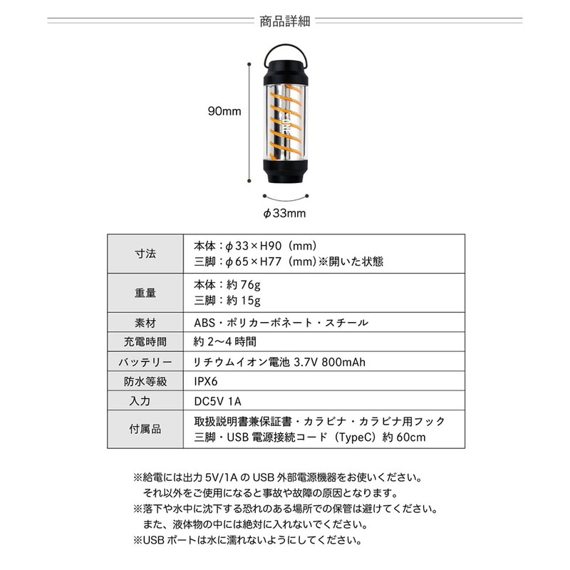 - Usage Environment: Indoor and outdoor; Waterproof grade: IPX6; Light source: LED (bulb color); Battery: Lithium battery 3.7 V, 800 mAh; Charging method: DC 5 V, 1 A (Type-C)