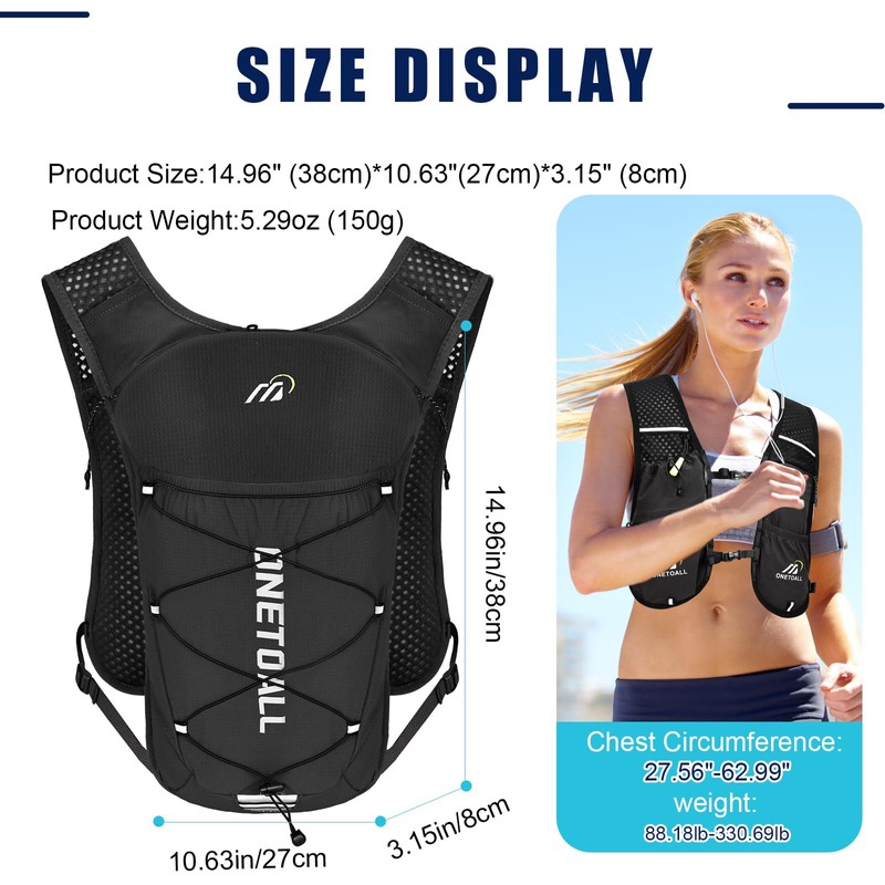- WEIGHING ONLY 150G: ONETOALL running vest is made of the lightweight fabric, weighing only 150g (5.29oz), and can hold 2 liters water in the main compartment.