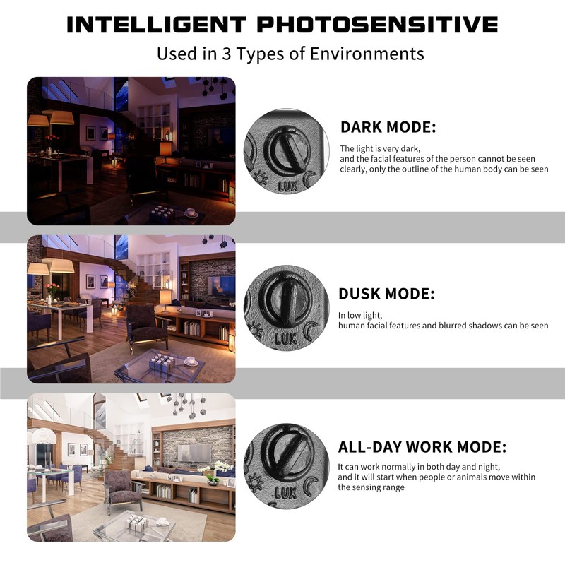 - 【Support Day / Night Dual Mode, More Choices For You】Turn the "LUX" knob to the 🌞 position to work in daylight, 🌜 NIGHT mode only works in the evening or dark environment, by controlling the threshold, your sensor light can work even in the not so dark night. The sensor probe is compatible with a variety of devices: solar lights, closet lights, ceiling lights, incandescent lights, LED light strips (<50w), exhaust fans, alarm light, it is a good backup replacement sensor.