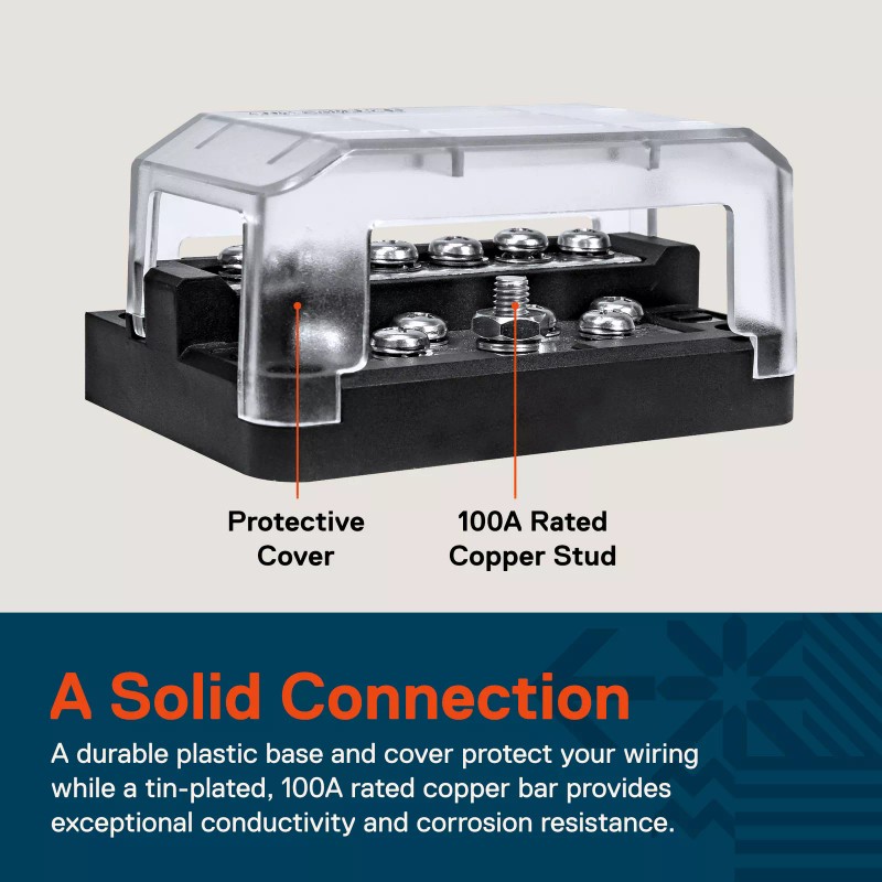 Whether it's lighting a trail or providing a soundtrack for your adventures, wiring makes the good times happen. And no matter where those good times take you, our bus bar is ready. Perfect for cleaning up the wiring on your car, truck, or boat, our universal bus bar comes with 12 grounding locations, a tin-plated copper bar for improved conductivity and corrosion resistance, and a 100A rating to keep all your accessories going without interruption.
