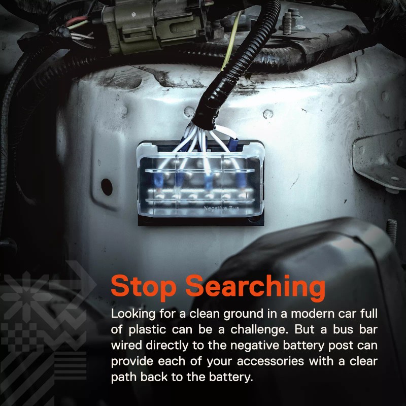 Every electrical component in your vehicle needs a ground connection. Without a solid ground, lights flicker, electric motors run slow, and frustration runs high. But with vehicle manufacturers using more plastics and aluminum, a good ground is becoming increasingly difficult to locate. Avoid the searching and headache with a dedicated ground bus bar. Our bus bar provides a convenient central location for all of your accessory ground wires and guarantees a clean, uninterrupted path back to the battery ground stud.