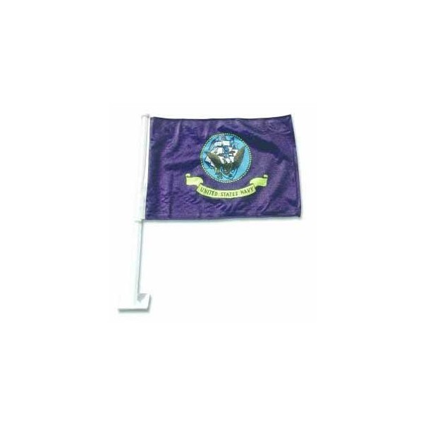 This Navy car flag is made of durable, knitted polyester and are double sided for longer life. The staff and window clip are made of nylon.