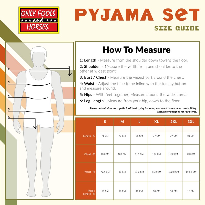 - This mens pyjamas shorts set is available in sizes ranging from S-3XL suitable for men and teens. See the images for the sizing chart to get the perfect fit and upgrade your summer wardrobe with these Only Fools and Horses mens loungers
