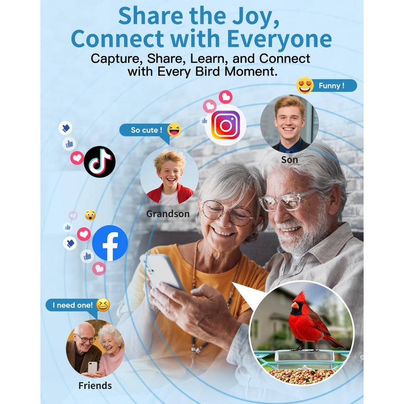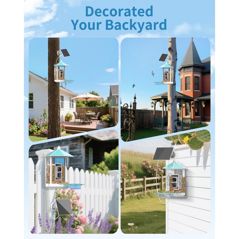 • 【Smart AI & Sharing Experience】With built-in AI bird recognition, this feeder can helps you instantly identify visiting species and learn fun facts, turning casual birdwatching into an educational journey for you and your family. You can share live footage or saved videos with friends, post on social media, or enjoy real-time viewing with up to 4 people at once. It's a smarter, more connected way to enjoy nature (30-day Free AI, 2.4GHz WiFi only)