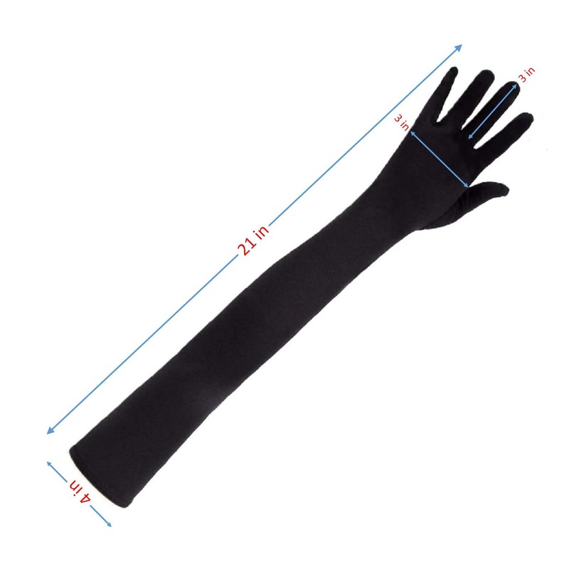 • PERFECT SIZE: Satin gloves are 21 inches in length from fingertip to the end, finger length is 3.2 inch. Fit you hands perfectly, one size suitable for most adults because of the high quality stretchy satin fabric. Notes: length, tight or loose depends on your arm circumference.
