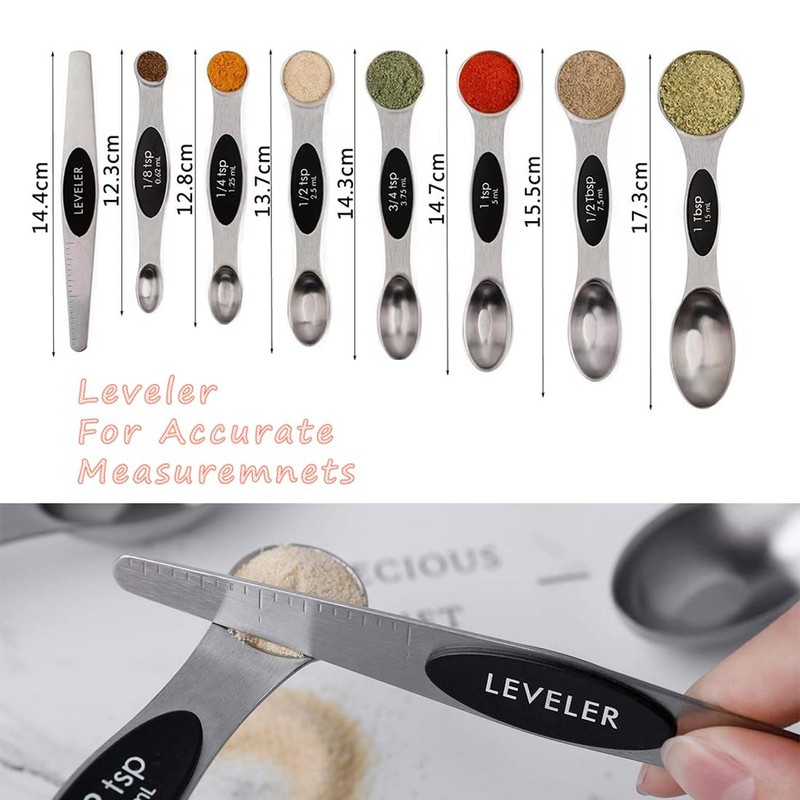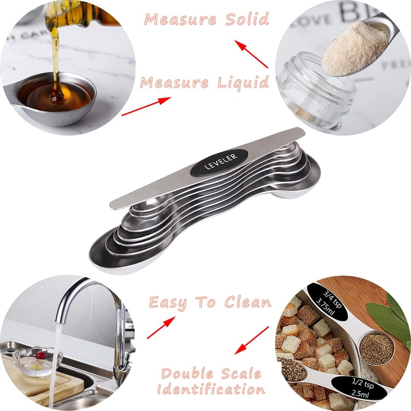 - đŒ Double Sided Design - The Measuring Spoons Double Ended Design Makes It Compatible For Measuring The Dry And Liquid Ingredient, Round End Measuring Liquid Ingredient, Narrow Oval End Can Fit In Most Spice Jars Or Bottles. Each Measurement Is Engraved On The Middle Of The Spoon, It Is Very Convenient For You To Choose.