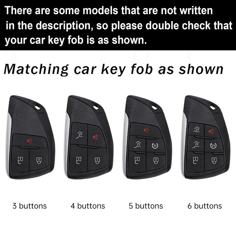• {Fits Models} : This key cover compatible with Chevy Silverado Suburban Tahoe 2021-2024,fit for GMC Yukon/XL/Denali,Sierra 1500 2500HD 3500HD 2021-2023,fit for Buick Encore Envision Avenir 2020-2024 etc.(fits 3/4/5/6 buttons key remote.)*NOTE*--Please refer to the matching keys shown on the picture.Because of the different years even if the same car model,the key fob may also be different