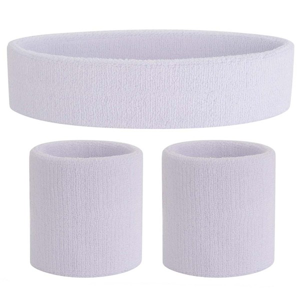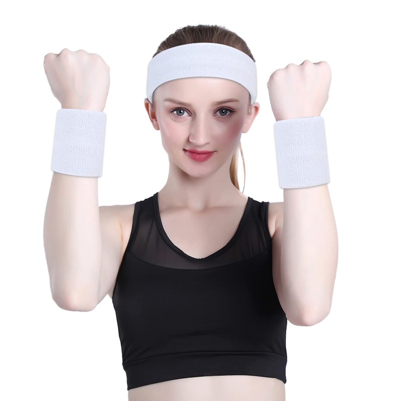 ONUPGO White Sweatband Set Sports Headband Wristband Set Sweatbands Terry Cloth Wristband Wrist Sweatband Headbands Moisture Wicking Sweat Absorbing Head Band