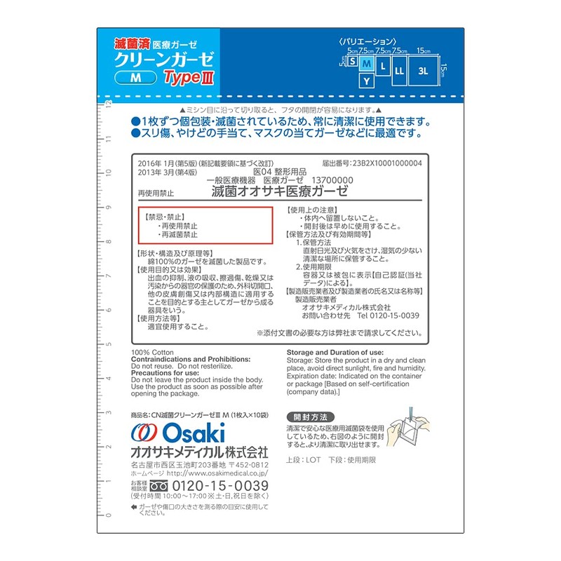OO Osaki(オオサキ) CN 滅菌クリーンガーゼIII M 10枚入(1枚入×10袋) 一般医療機器 15286