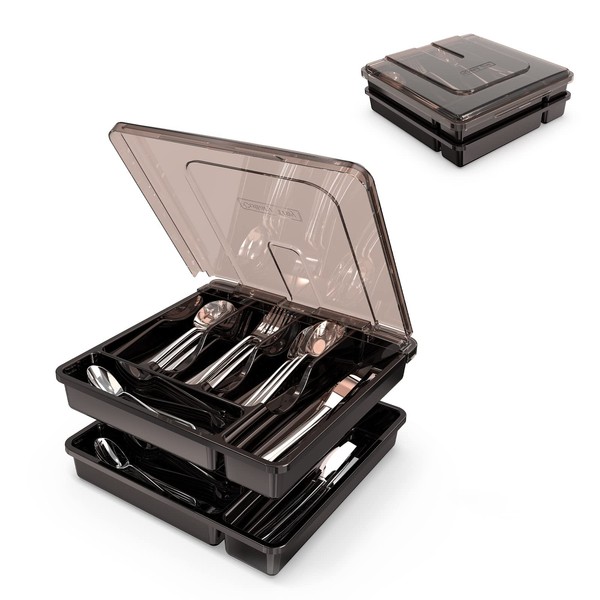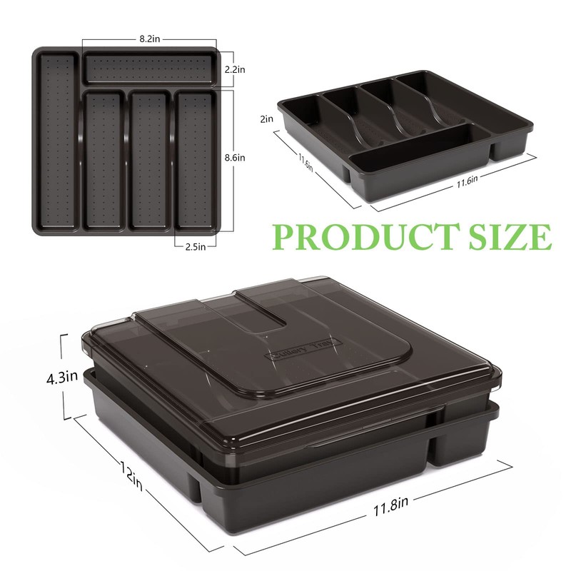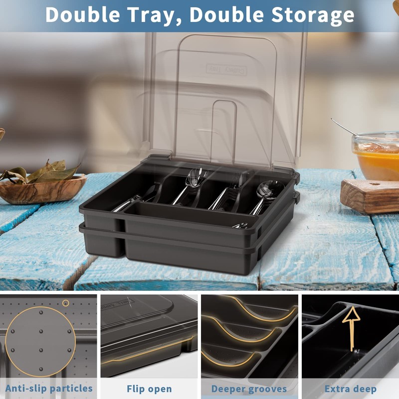 - ✔️ [2 Layer Silverware Tray With Lid] Our silverware tray is ideal for saving kitchen storage space, thanks to its double storage drawers. Designed with 10 compartments, the silverware organizer can save space while accommodating multiple items.