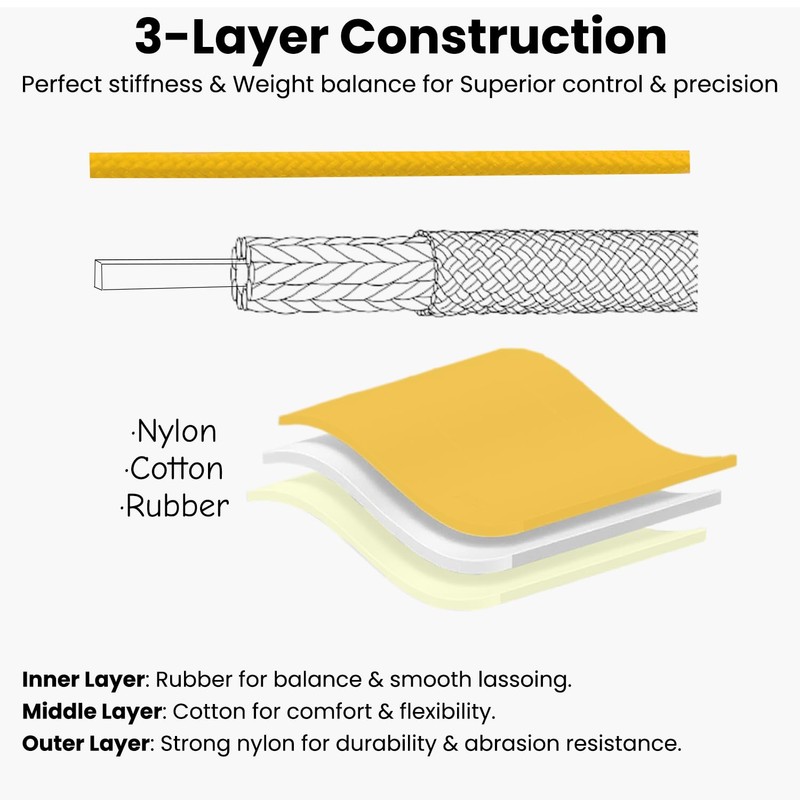 - Inner Layer: Rubber for optimal balance and weight, ensuring smooth and accurate lassoing.