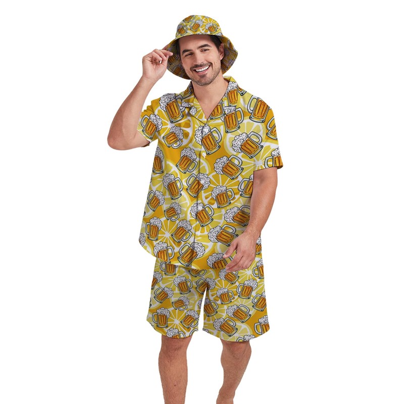 OOTBIN Mens 3 Piece Tracksuit Funny Hawaiian Shirt and Shorts Sets Beer Shirts for Men Festival Button Down Beach Outfits with Bucket Hats Large