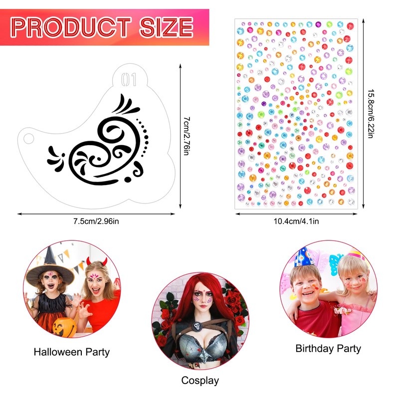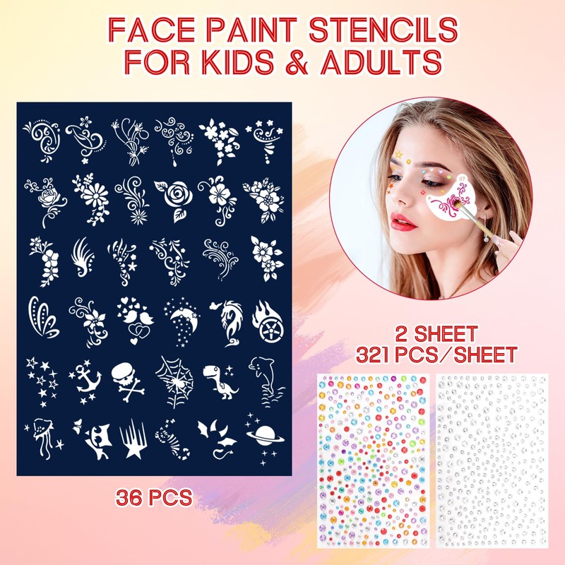 - 🌈Creative Face Painting: With the combination of face painting stencils and jewel stickers, unleash your imagination to create unique designs in less time. Perfect for kids' parties, Halloween, Christmas, or other artistic occasions, offering endless creative opportunities.