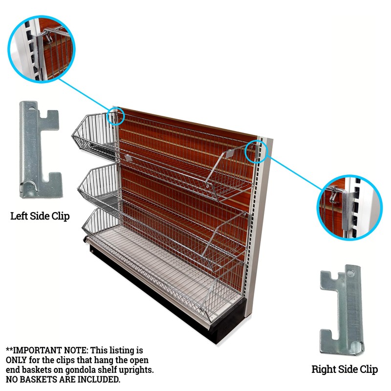 - Use these open end basket clips to hang wire open end baskets on your gondola shelving units. Note: These will only fit on Madix or lozier gondola shelf uprights.