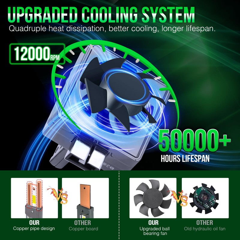 - 【Upgraded Cooling System】 Newest cooling system d3s led headlight bulbs. Newest copper pipe design & pure copper light source board & ball bearing fan & aviation aluminum body provide the fast cooling, which make the lifespan of the d3s led bulb more longer.