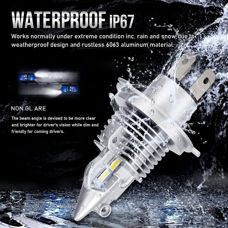 - ★【H4 Led Headlight Bulbs Hi/Lo Beam】10000 LM (5000 LM per bulb), perfect focused high low beam pattern, brightness 200% higher than that of standard halogen bulbs, 70W high power (20W per bulb), 6500K xenon white, provides the best driving vision at night.