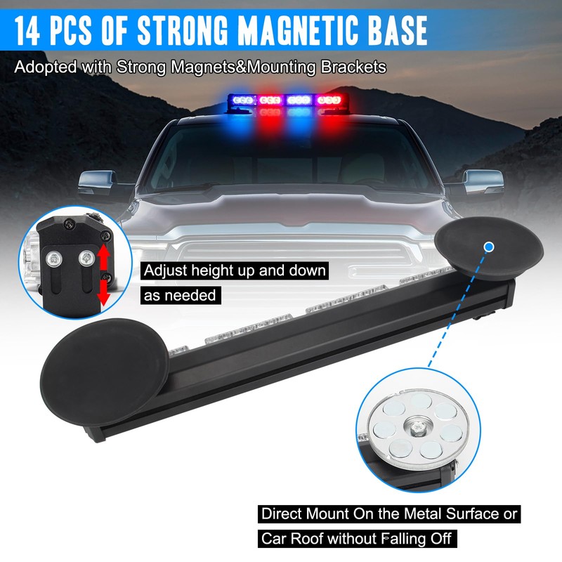 - 4.【Easy to Install】LED strobe warning light with 2*7pcs strong magnetic base, this LED beacon light can be securely attached to any metal surface to prevent it falling off.Widely used for 12-24V emergency vehicles and tow trucks, construction vehicles,snowplow,etc.