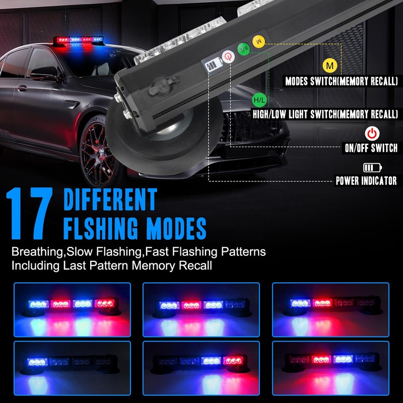 - 3.【17 Different Flashing Modes】17 different flash patterns can choose from with last pattern memory recall function,just press the M button to switch different modes,including fast flashing,slow flashing,breathing,double flashing,alternately flashing,static,modes&Hi/lo modes.Make your love car stand out,and enhancing your visibility and safety on the road.