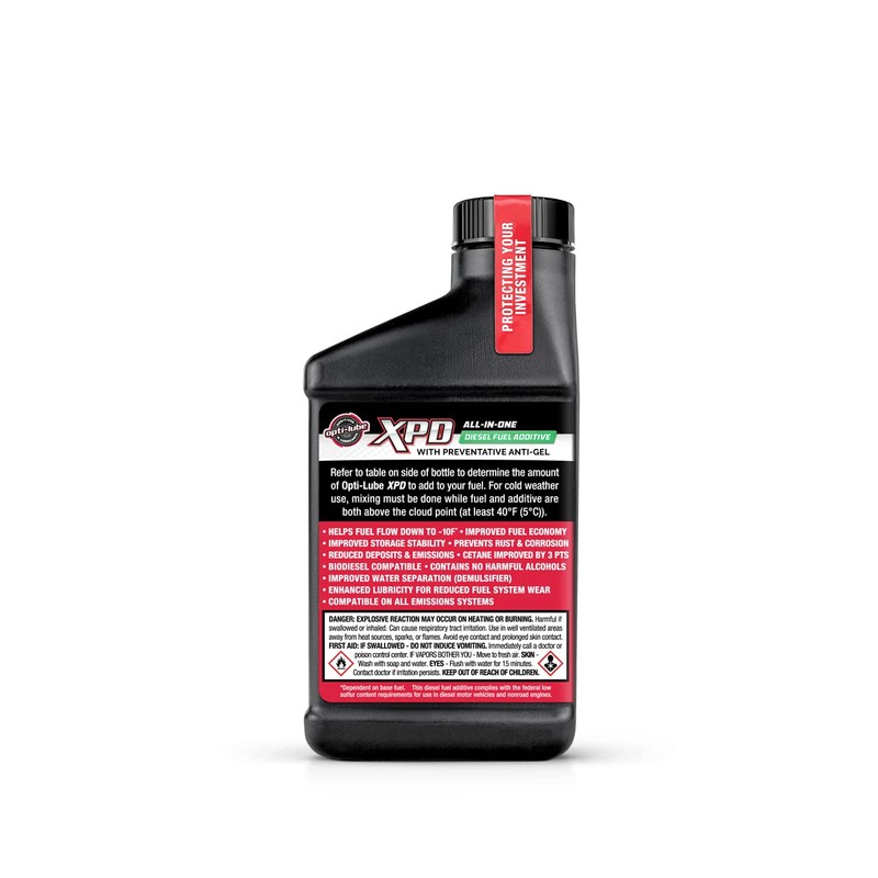 - ENHANCES PERFORMANCE: Whether during rain, snow, or shine, Opti-Lube XPD formula delivers. It works to improve the performance of your truck all year round. Not only does XPD boost Cetane by up to 3 points, this fuel additive also helps separate water from Diesel fuel as a demulsifier and more than doubles the storage life of standard diesel fuel.