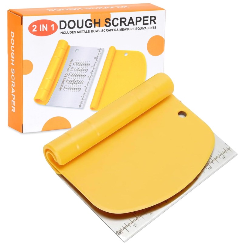 - High-quality material: the metal dough scraper is made of high-quality stainless steel with a sharp robust blade as well as a precise measuring scale with size indication in inches and centimeters. The dough spatula is made of high quality PE plastic. The set is food safe, odourless and rust-free.
