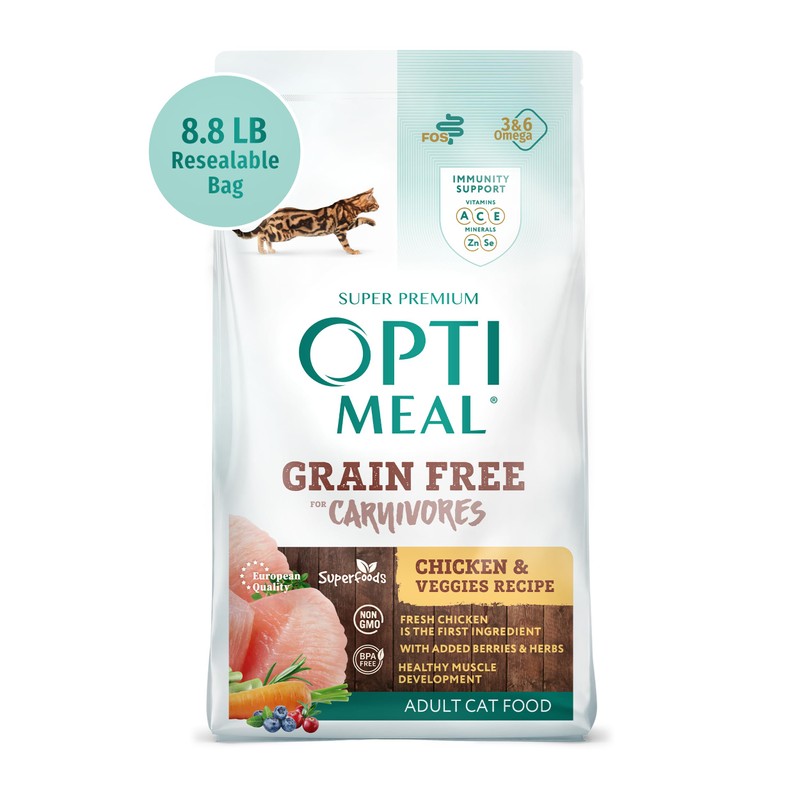 OPtimeal Grain Free Cat Food - Proudly Ukrainian - Healthy Cat Food Dry Recipe for Gut Health, Tasty Dry Cat Food with Immunity Support for Adult Cats (8.8 lbs, Chicken & Veggies)