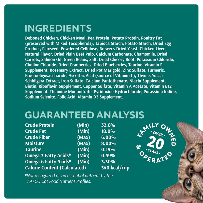 Complete and balanced natural cat food with added vitamins, minerals, and other healthy nutrients.