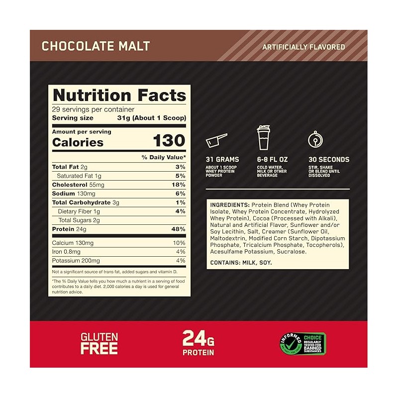Optimum Nutrition Gold Standard 100% Whey Protein Powder, Chocolate Malt, 2 Pound (Packaging May Vary)