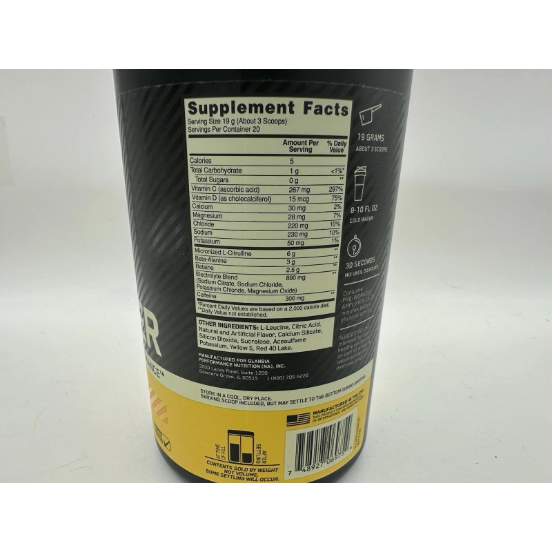 Optimum Nutrition Pre-Workout Amplifier in delicious Citrus Mango flavor delivers intense energy, pumps, and performance. This high-stimulant pre-workout includes an electrolyte blend for hydration, along with 6 grams of micronized l-citrulline, 3 grams of beta-alanine, 2.5 grams of betaine and 300 mg of caffeine to support energy and performance. Other ingredients include vitamin C (ascorbic acid), vitamin D (as cholecalciferol) and l-leucine. With zero sugar and just 5 calories, you can feel good about your pre-workout drink mix. It mixes easily in a shaker cup, making it perfect for your gym bag and training routine. Add 19 grams (about 3 scoops) into 8-10 fl oz of cold water and mix for 30 seconds until dissolved. Consume 15-30 minutes before physical activity. Optimum Nutrition is the World's #1 Sports Nutrition Brand. Our products are banned substance tested with highest quality control measures so you feel comfortable and safe consuming this product.