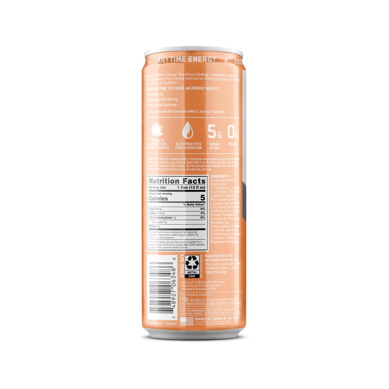 Optimum Nutrition Amino Energy Sparkling Hydration Drink, Electrolytes, Caffeine, Amino Acids, BCAAs, Sugar Free, Peach Bellini, 12 Fl Oz, 12 Pack (Packaging May Vary)